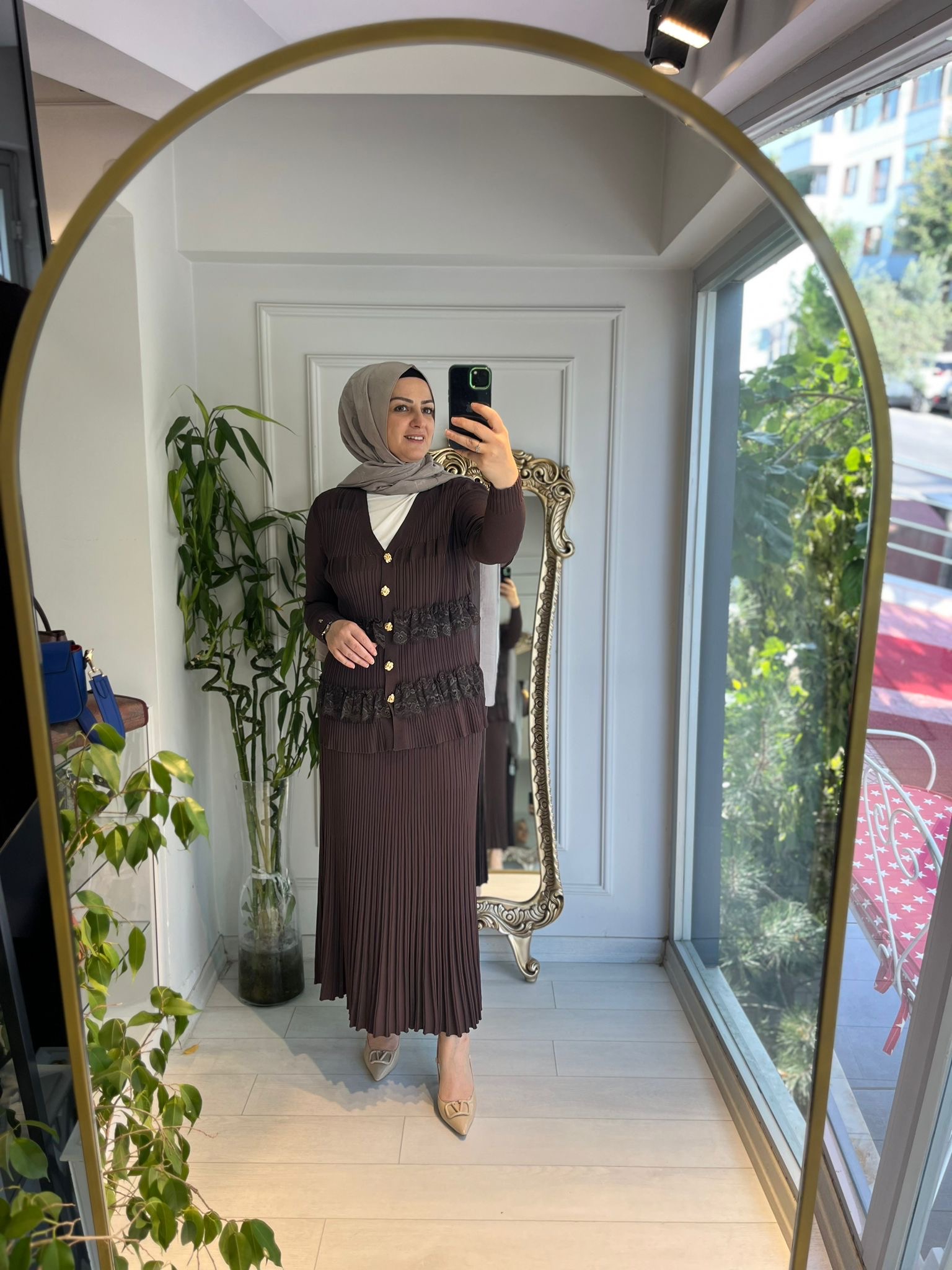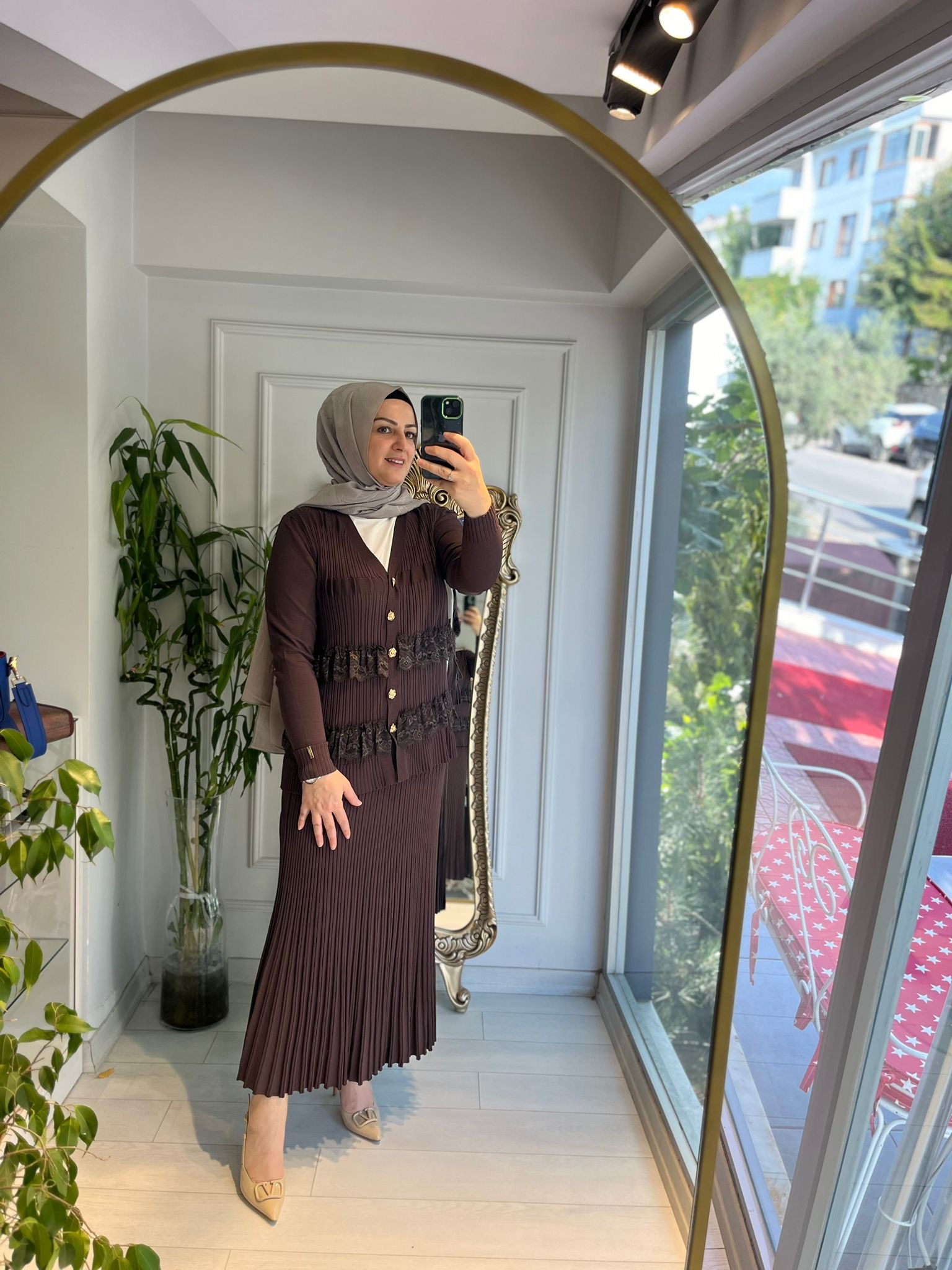 Etek ucu 2 Sıra Dantel Hırka Kahve