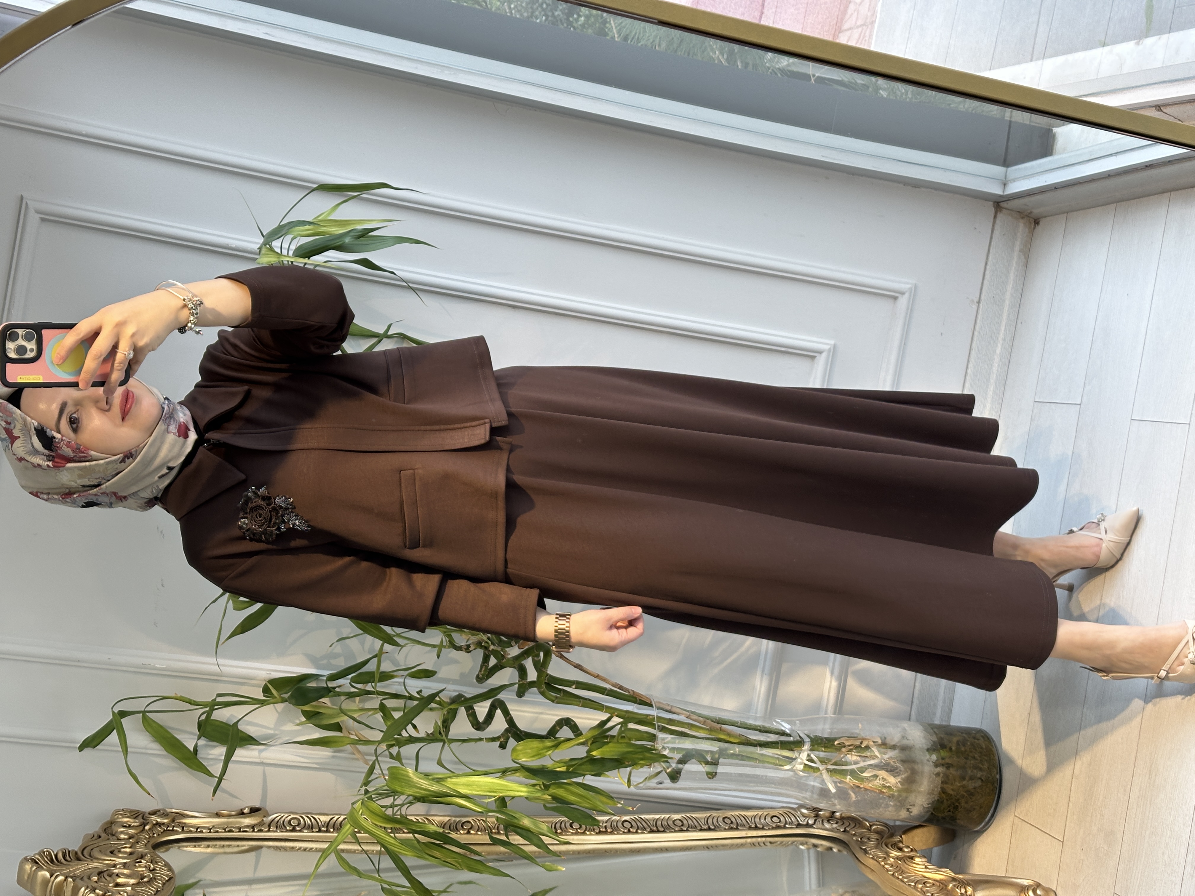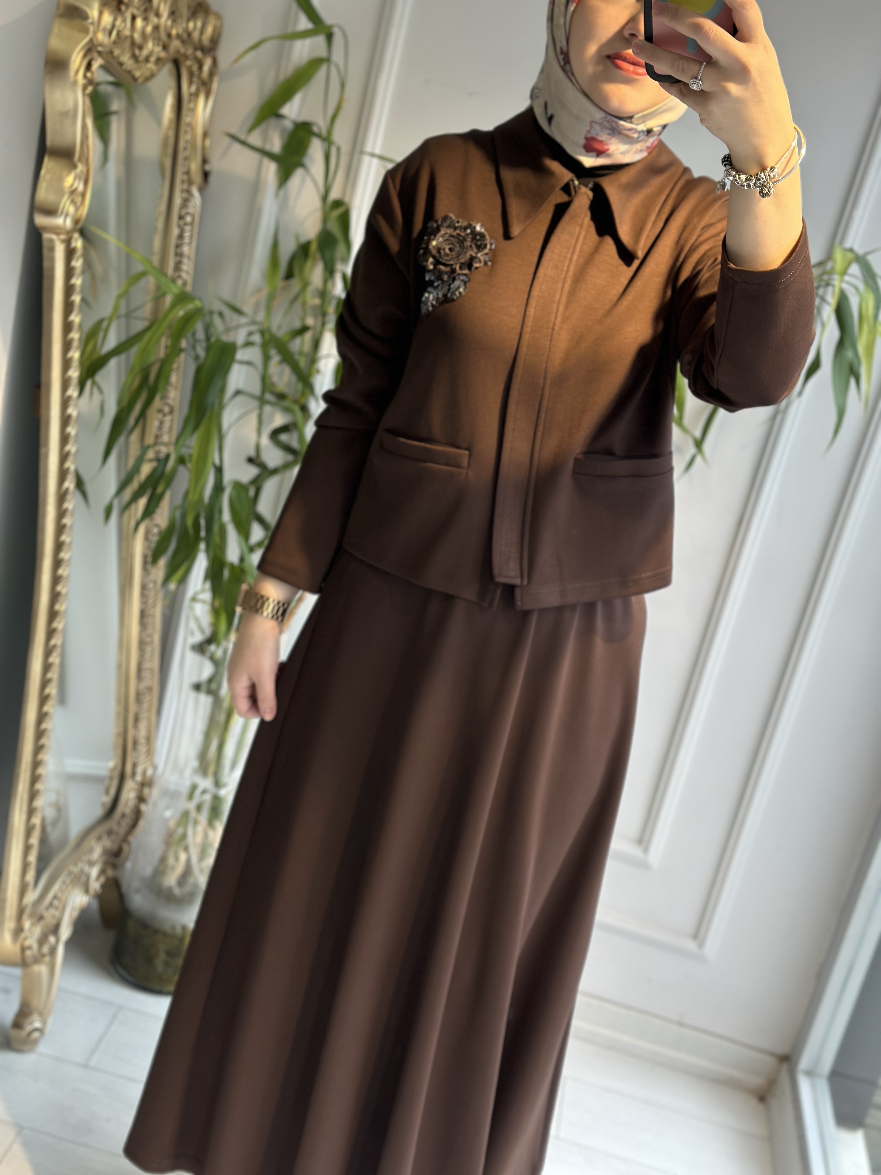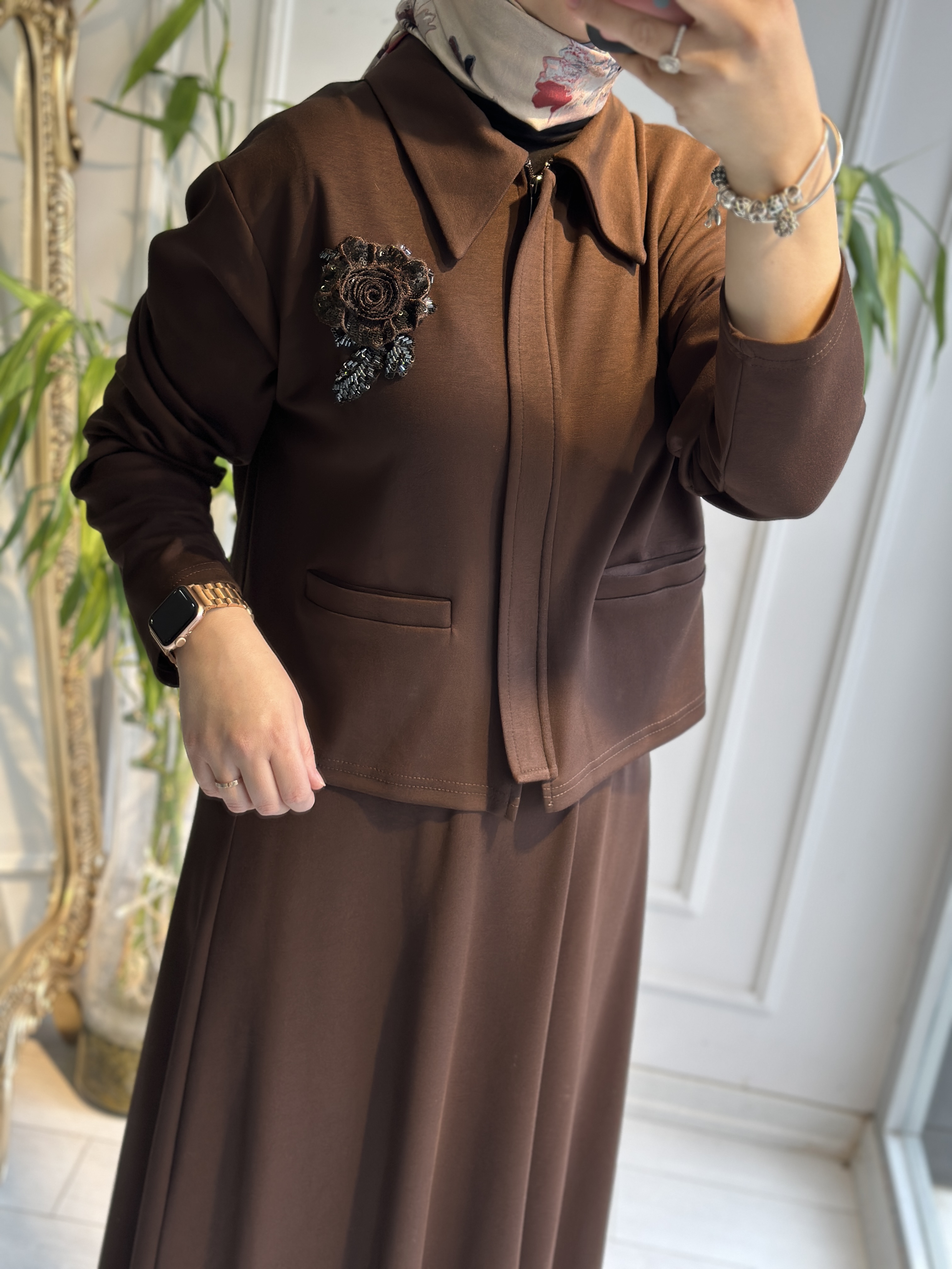 Modal kumaş yaka gül payetli etekli takım kahve