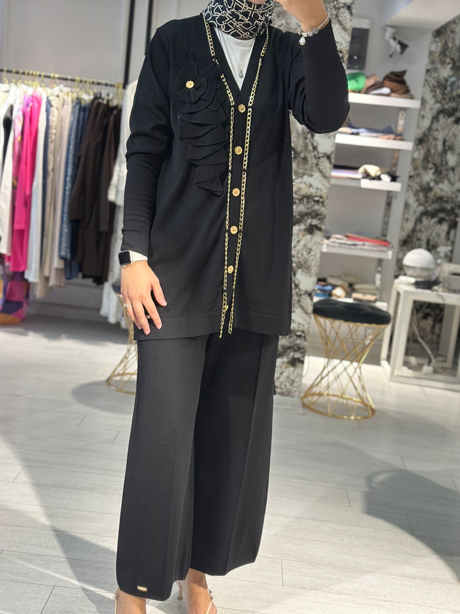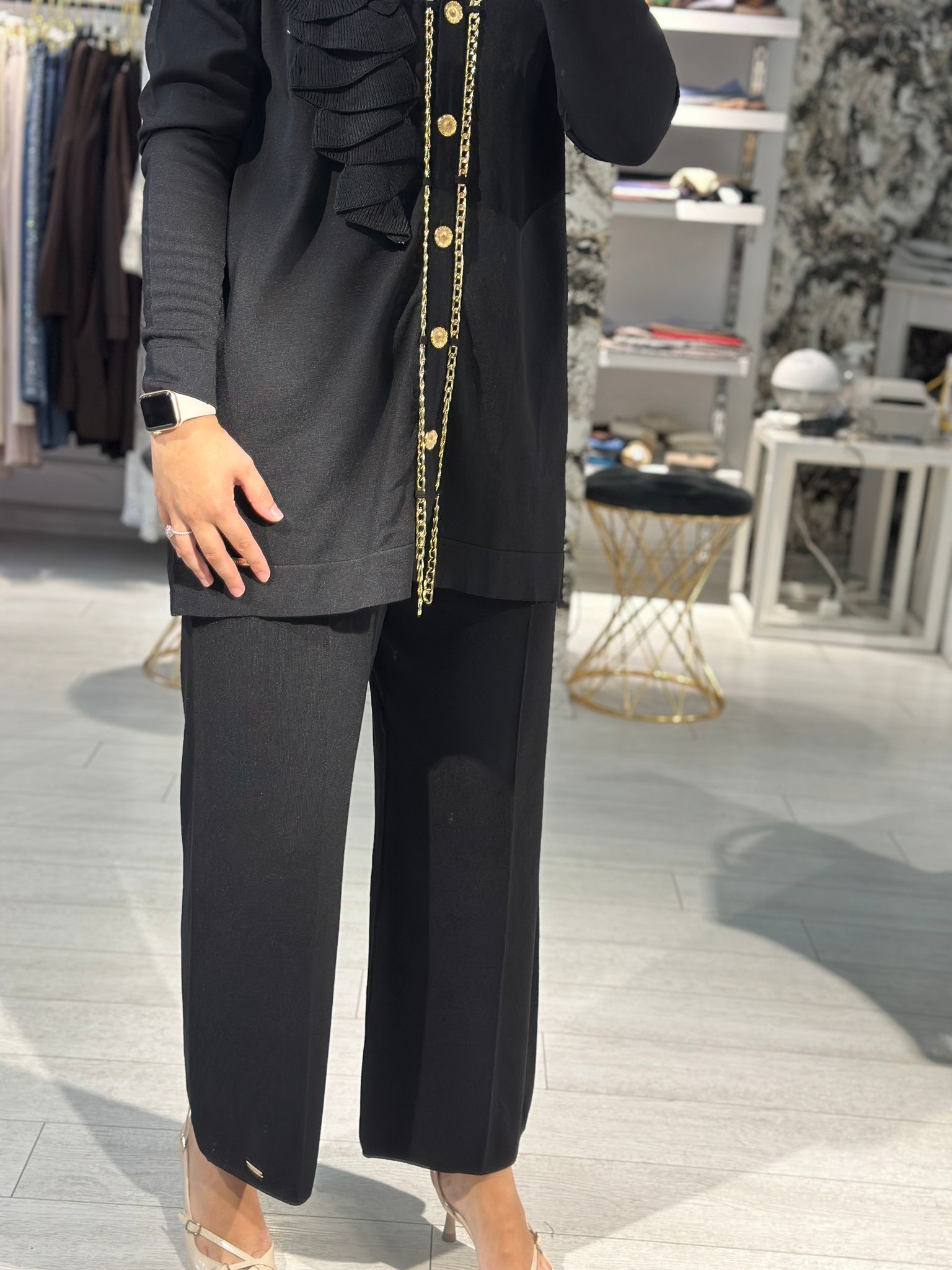 Nervürlü Bol Paça Merserize Pantolon Siyah