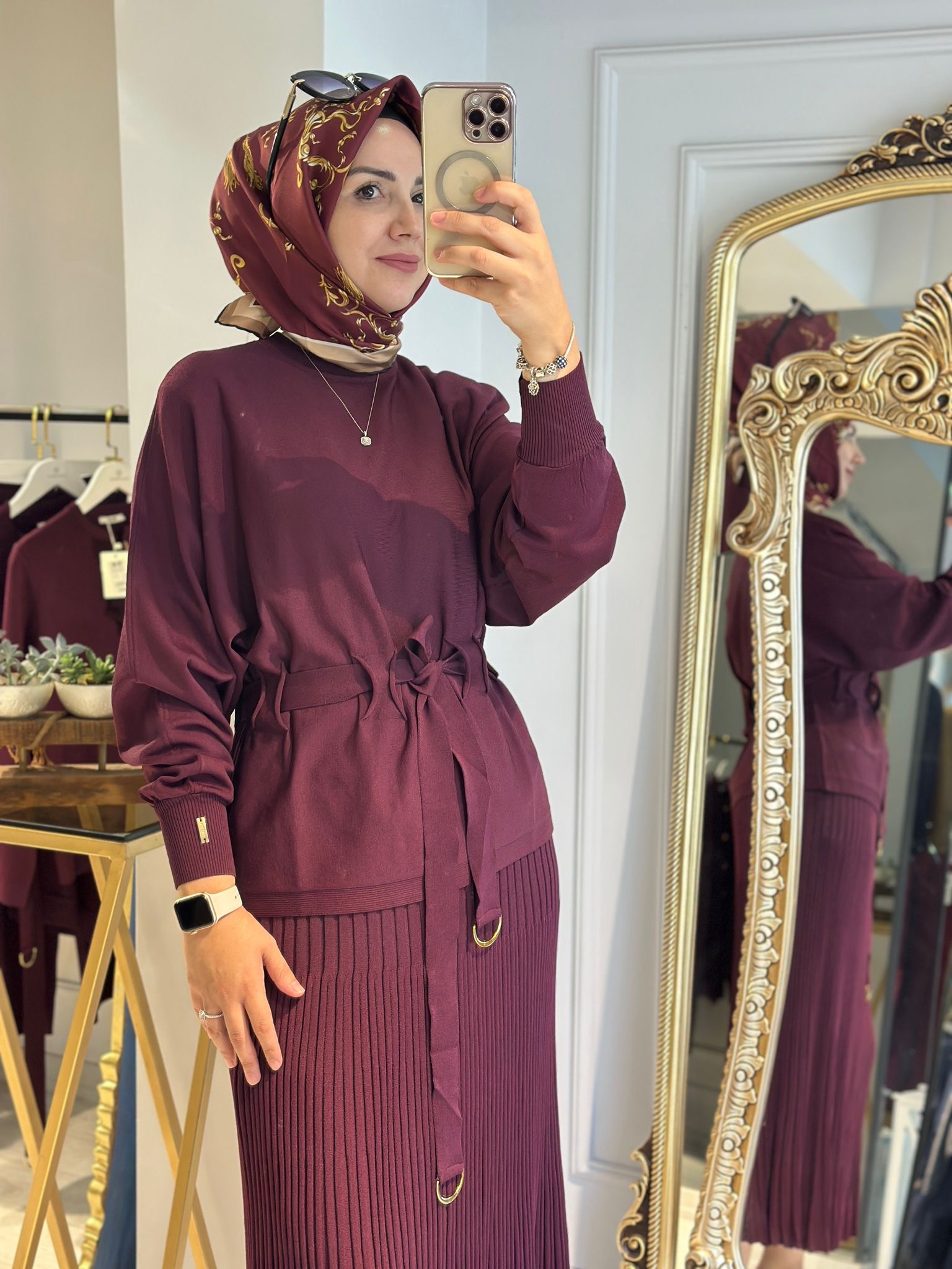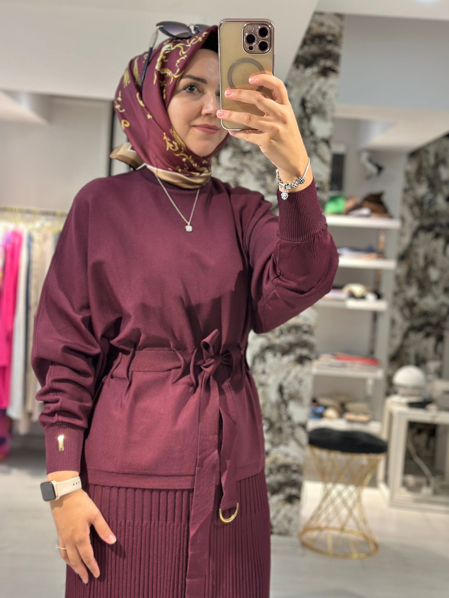Yarasa Kol Belden Büzgülü Kısa Tunik Bordo