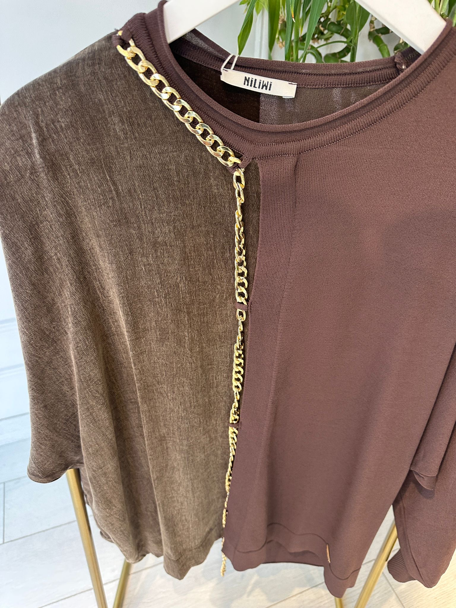 Yarısı Kumaş Zincirli Yarasa Bluz Kahve
